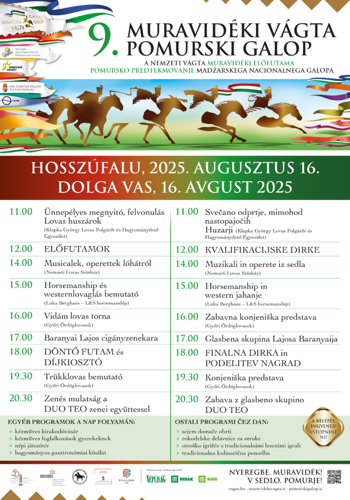 - Pomurski galop se bo odvijal v soboto, 16. 8. 2025 v Dolgi vasi. Na galop se lahko prijavijo konjeniki, ki so dopolnili 18 let, ali pa v dirko za ponije do 17. leta. Udeleženci lahko sodelujejo s katero koli pasmo in spolom konja, razen angleškega čistokrvnega konja ali argentinskega ponija. Genetska zastopanost angleškega čistokrvnega konja in delno neznanega izvora ne sme presegati 75 % (rodovniki se pregledujejo do 2. kolena, torej do starih staršev).